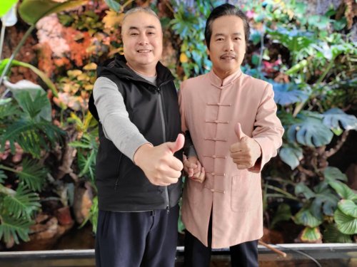 瑞雅地产王志广先生(左)与监制夏云飞(右)双手交握,面带亲切笑容,眼神中满是对彼此