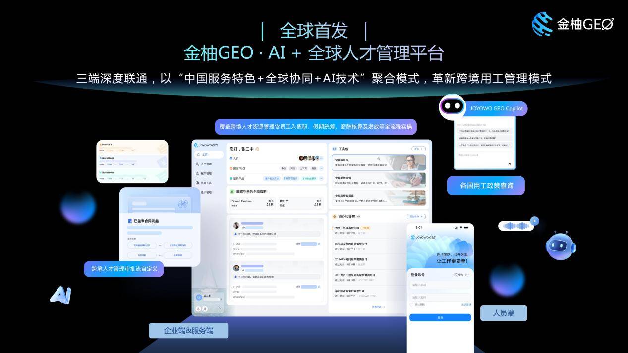 其中,“金柚GEO・AI+全球人才管理平台”突破性地将中国特色人力资源服务经验与全球人才管理场景深度融合,成功打通企业、员工、服务商三端数据与流程,实现跨境人力资源管理的深度连通与高效协同。平台功能覆盖跨境员工入离职、假期统筹、薪酬核算及合规发放等全流程,同时嵌入自研AI Agent解决方案(JOYOWO GEO Copilot),实现合规风险前置预警,显著提升服务响应速度与处理效率。该平台不仅填补了“中国服务特色+全球协同+AI技术”在跨境人力管理领域的融合空白,更以行业首发姿态重新定义了全球化人力资源服务的高标准。